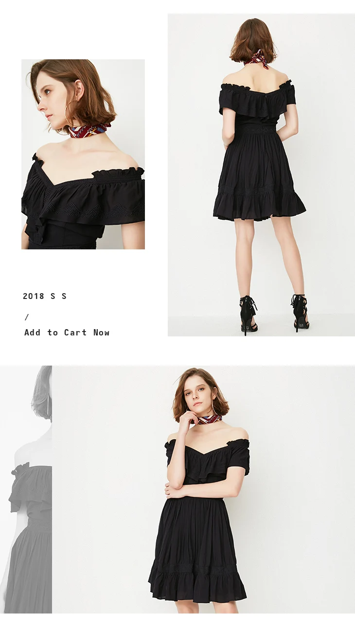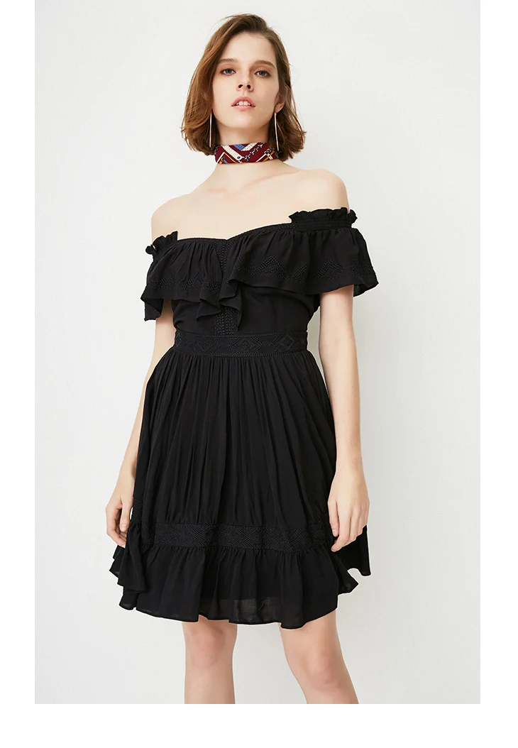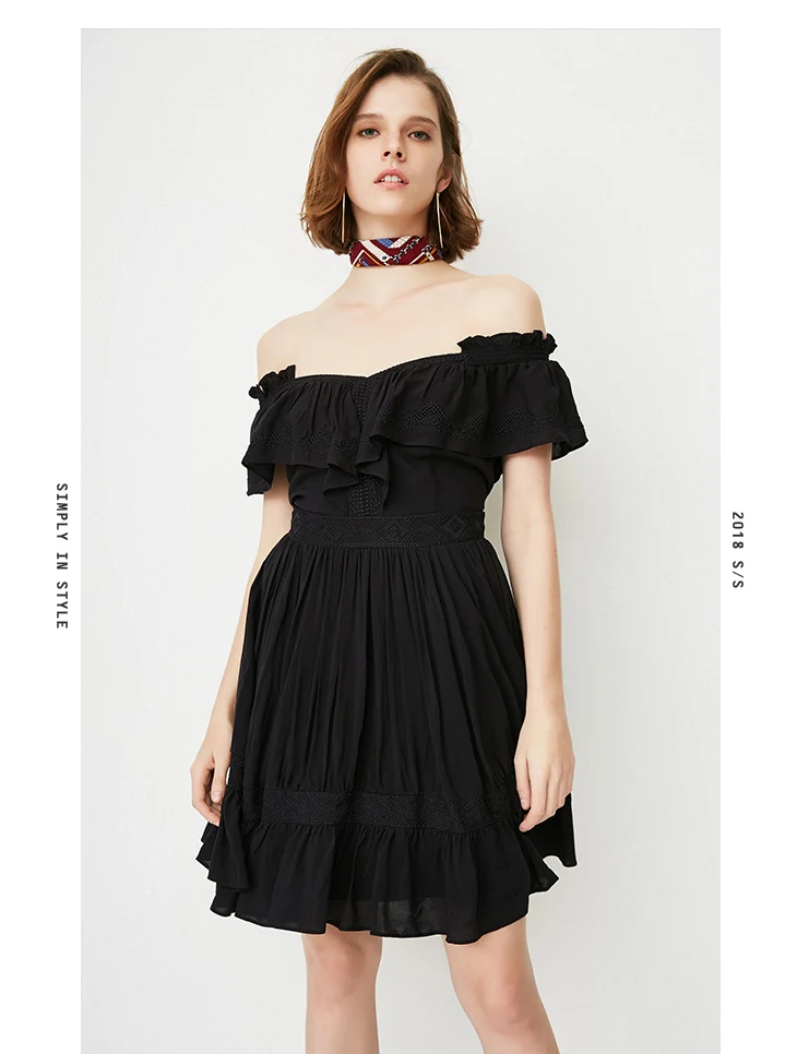 ONLY Brand 2018 NEW slash neck embroidery vintage simple V-Neck ruffled hem women dress |118107671