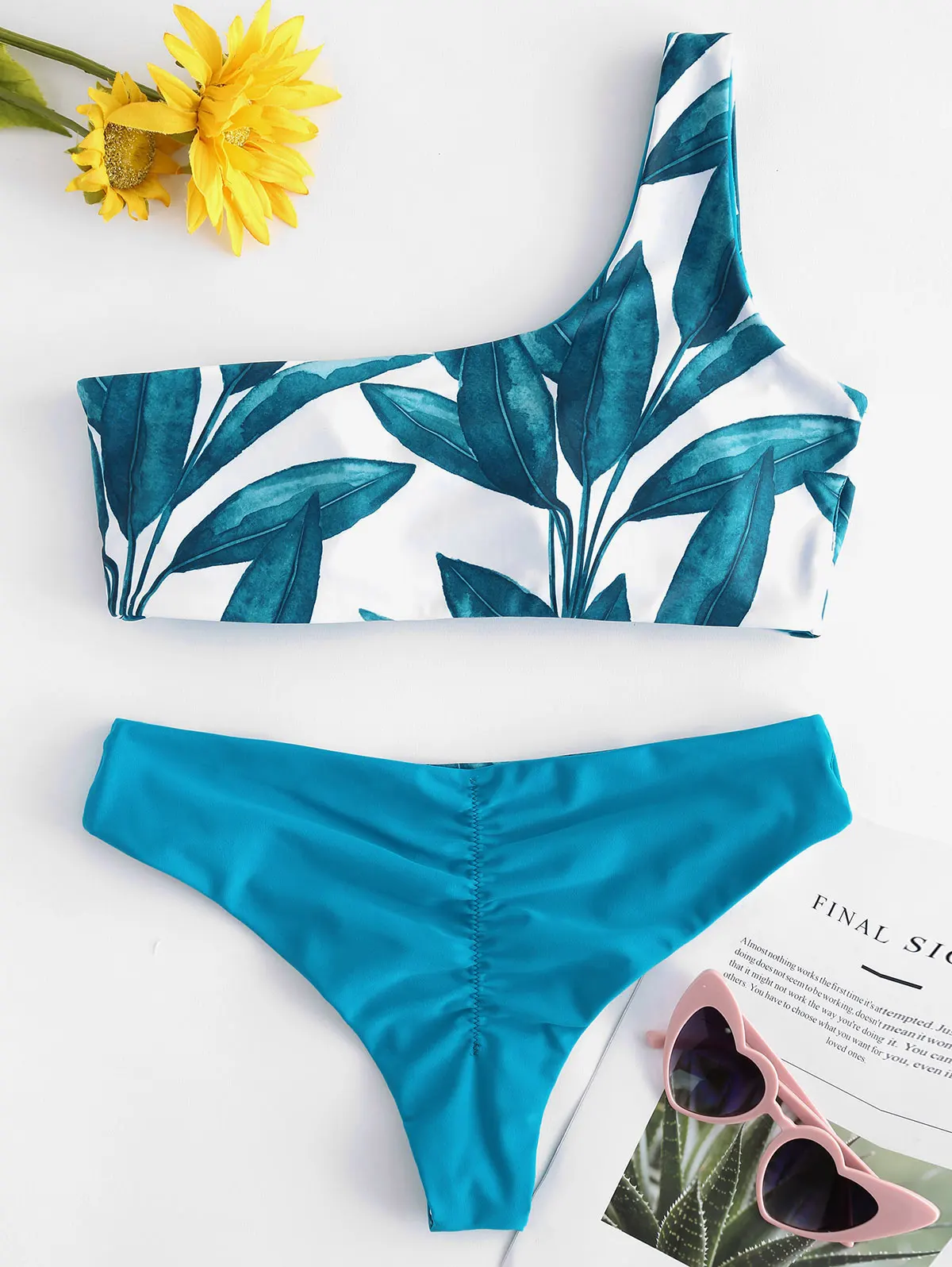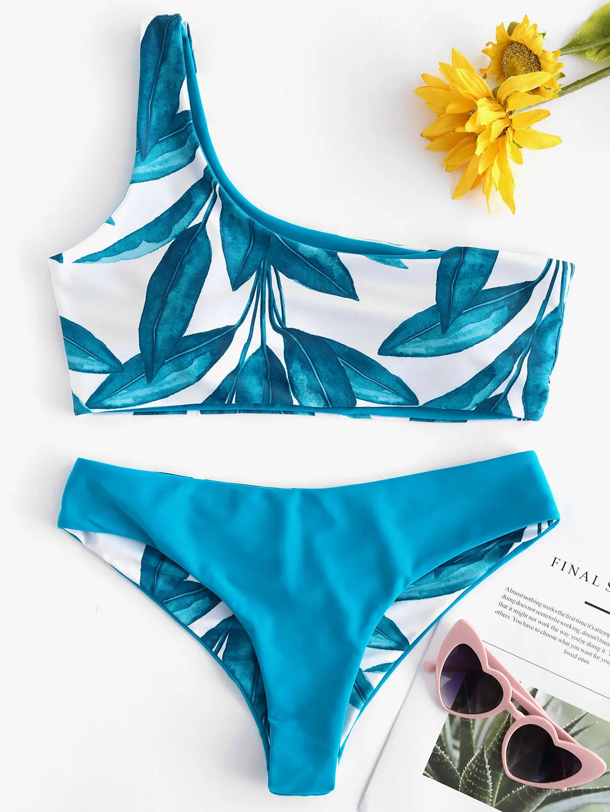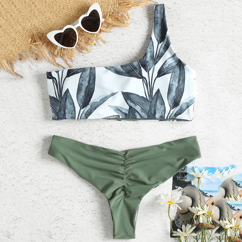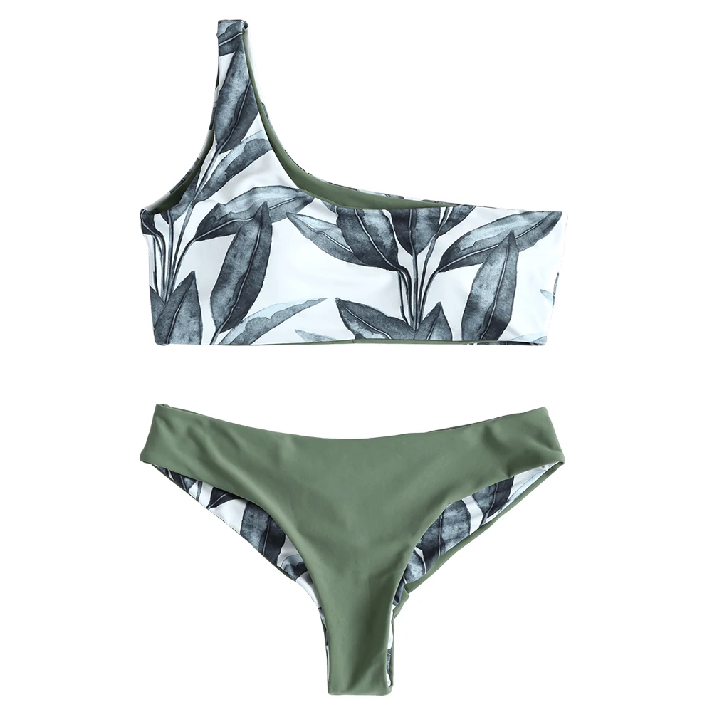 ZAFUL One Shoulder Leaves Print Bikini Sexy Bathing Suit Push Up Swimming Suit Swimwear Beachwear for Women