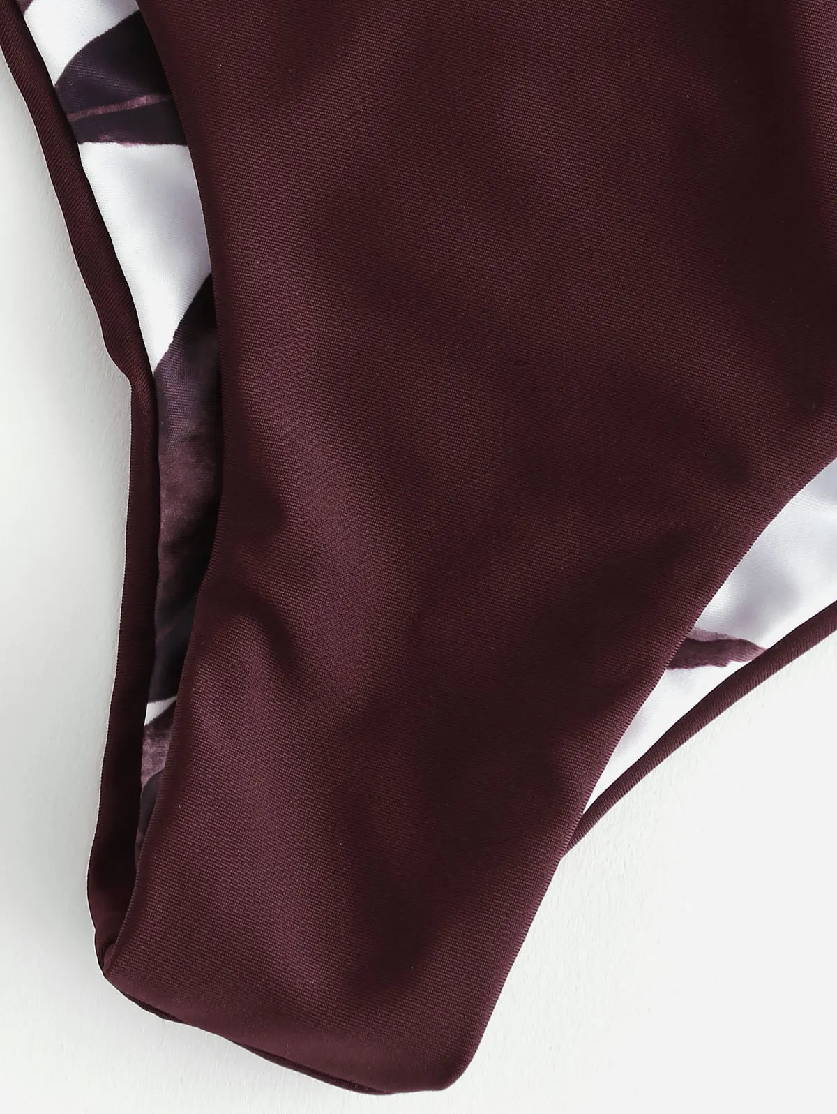One-shoulder trends are so in vogue, thus we have this bikini style for your fashion summer! The one-shoulder bra features leaves all over to offer vibrant vibe for the season while the low waisted briefs with lined prints for a contrast look. And the ruches at the bottom back are too chic to accent the curves.