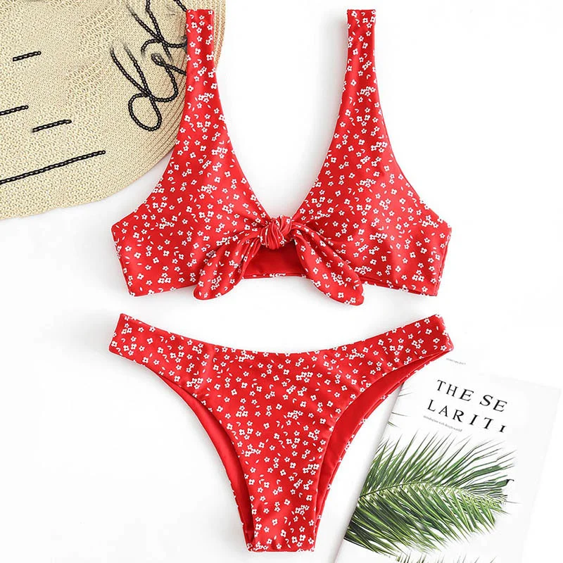 A perfect swimsuit for floral faves! Crafted from tiny floral prints all over, this bikini covers a plunge top with a self-tie knot on the front and a pair of low waisted briefs to complete the look. Style it with sunnies and cover-ups to lie on the beach, you will be a wonderful landscape.