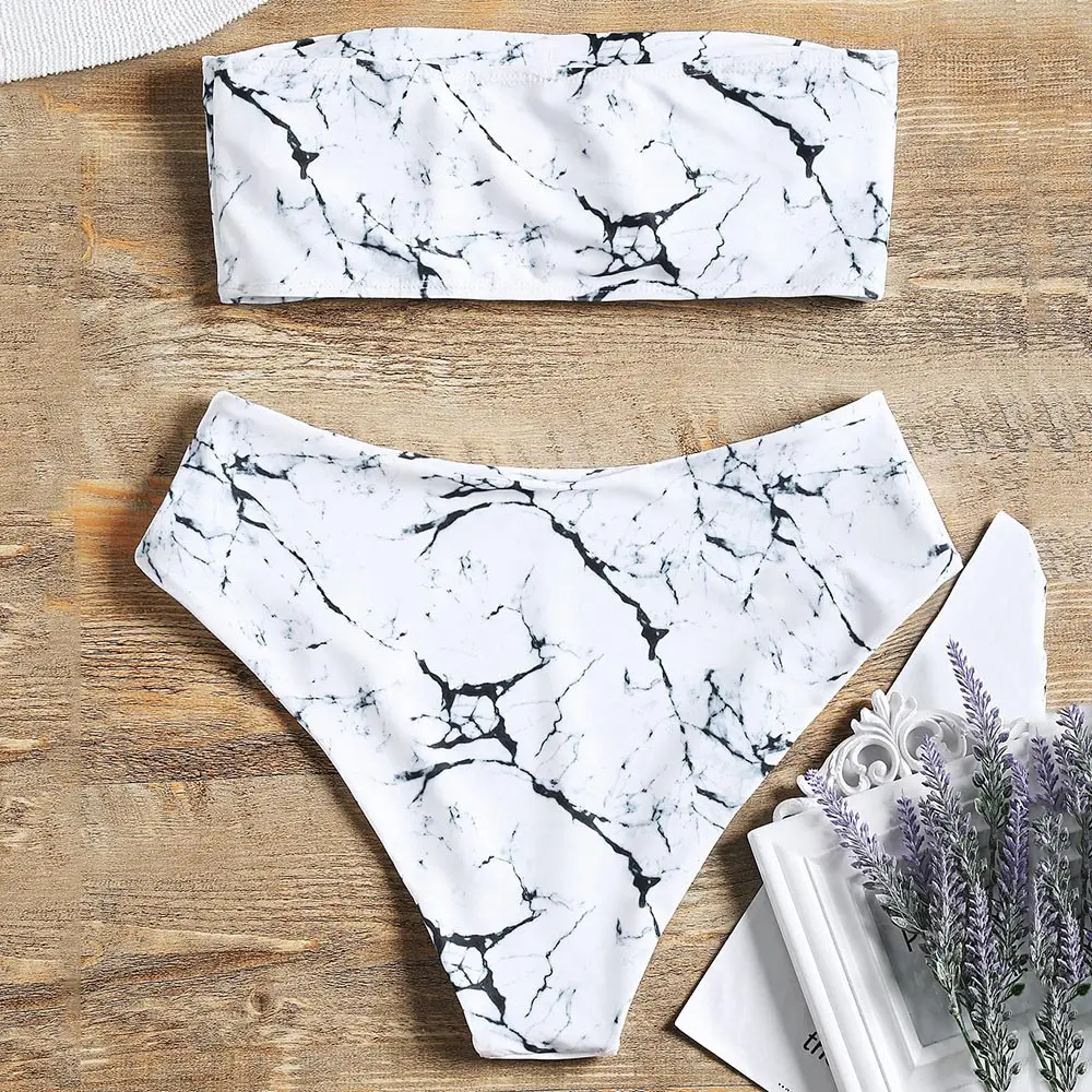 ZAFUL Strapless Marble Print High Waisted Bathing Suit Women Swimsuit Bathing Suit Marbling Print Swimwear Beachwear